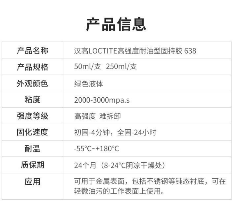 乐泰638是一种����� �������Ƴ����������� �������Ƴ������������ �������Ƴ����������� �������Ƴ�������高粘合强度的圆柱形配合件固持胶。它可以����� �������Ƴ������������ �������Ƴ������������ �������Ƴ����������� �������Ƴ�������填充圆柱形部件间的所有间隙并固化形����� �������Ƴ������������ �������Ƴ����������� �������Ƴ������������ �������Ƴ�������成坚硬的热固性塑料使部件结合成一整体,防止����� �������Ƴ������������ �������Ƴ������������ �������Ƴ������������ �������Ƴ������冲击和振动引起的松动和泄漏。该产品����� �������Ƴ������������ �������Ƴ������������ �������Ƴ������������ �������Ƴ�������在所有金属表面上均可实现高����� �������Ƴ������������ �������Ƴ������������ �������Ƴ������������ �������Ƴ�������强度,包括不锈钢等钝态衬底同时,该����� �������Ƴ������������ �������Ƴ������������ �������Ƴ������������ �������Ƴ�������产品也具有耐受表面轻微污染的特性。 ����� �������Ƴ������������ �������Ƴ������������ �������Ƴ������������ �������Ƴ������