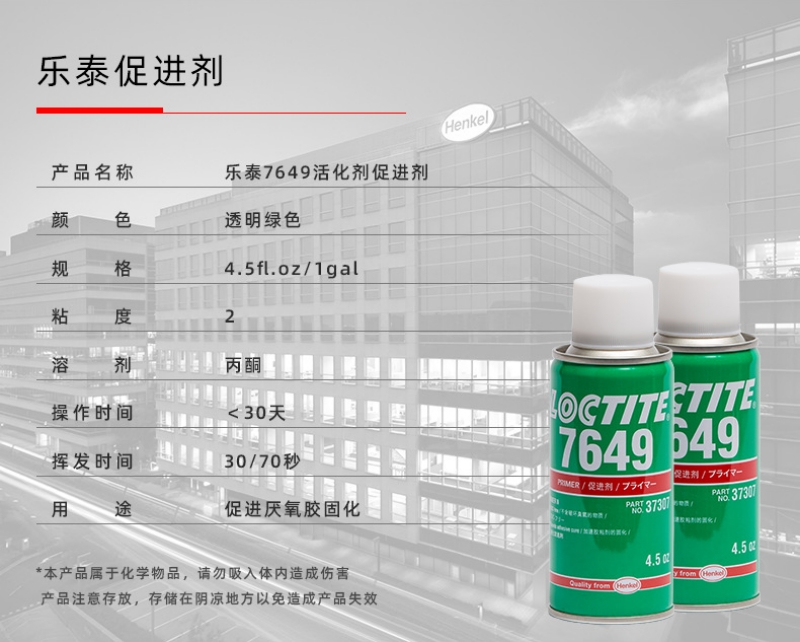 乐泰7649活化剂是一种不含CFC����� �������Ƴ������������ �������Ƴ������������ �������Ƴ������������ �������Ƴ�������,单组分溶剂型表面活化剂。该活化剂����� �������Ƴ������������ �������Ƴ������������ �������Ƴ������������ �������Ƴ������主要用来提高����� �������Ƴ��������� �������Ƴ������������ �������Ƴ������������ �������Ƴ������������ �������Ƴ����������所有乐泰厌氧胶和密封胶的固化速度。该活化剂����� �������Ƴ����������� �������Ƴ������������ �������Ƴ������������ �������Ƴ������是一种高度易燃品。